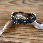 Dark gray narrow bracelet with many metal elements on the edge and in the middle.