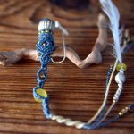 Long blue-white-yellow dread bead with extensions of different lengths, metal elements and a real feather.