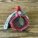 Gray rock crystal pendant in red with metal feather and white glass bead. Either with a matching necklace or without, please choose.