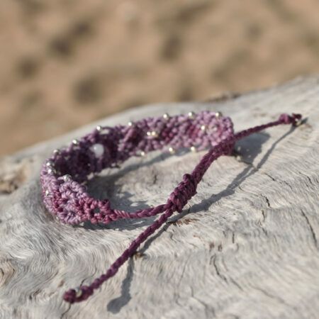 Dark gray narrow bracelet with many metal elements on the edge and in the middle.